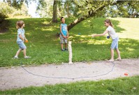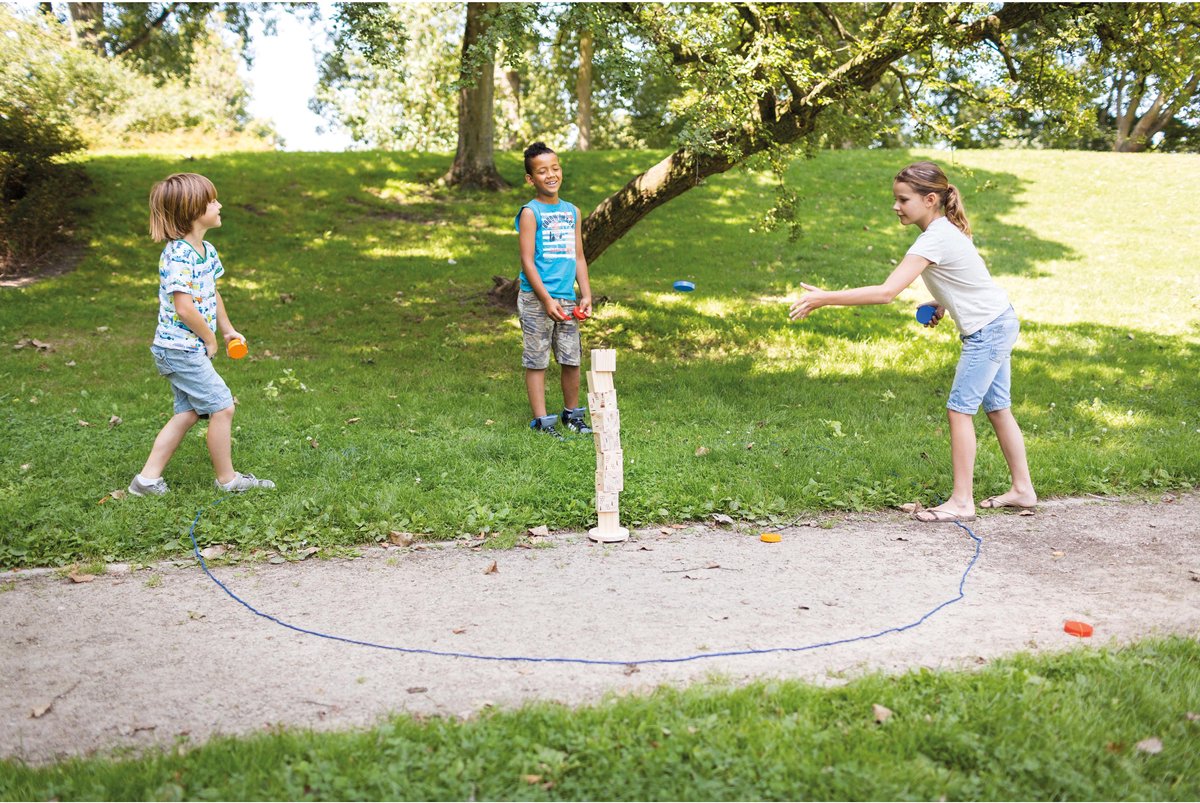 Dit leuke werpspel bevordert hand-oog coördinatie en concentratievermogen. Kan zowel individueel als met anderen gespeeld worden. De houten blokken, die geen echte kubussen zijn, worden op elkaar gestapeld tot een wankele toren. Rondom de toren is het mogelijk om met het bijgeleverde touw een cirkel te vormen en de gooi afstand te kiezen. De spelers gooien omstebeurt met hun schijf richting de bovenste blok. Als ze die eraf gooien, zonder dat de toren omvalt, winnen ze de blok.